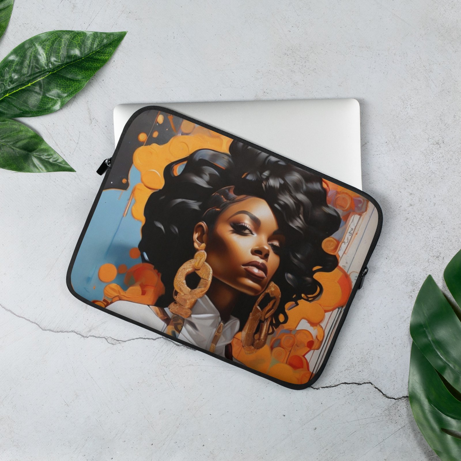 The “Power, Confidence, Art in Motion” Laptop Sleeve is the ultimate fusion of high-fashion art and robust protection. Featuring the captivating image of a confident woman—all dramatic hair, statement gold, and fierce gaze—set against a vibrant orange and teal backdrop, this sleeve ensures your tech travels in style.
