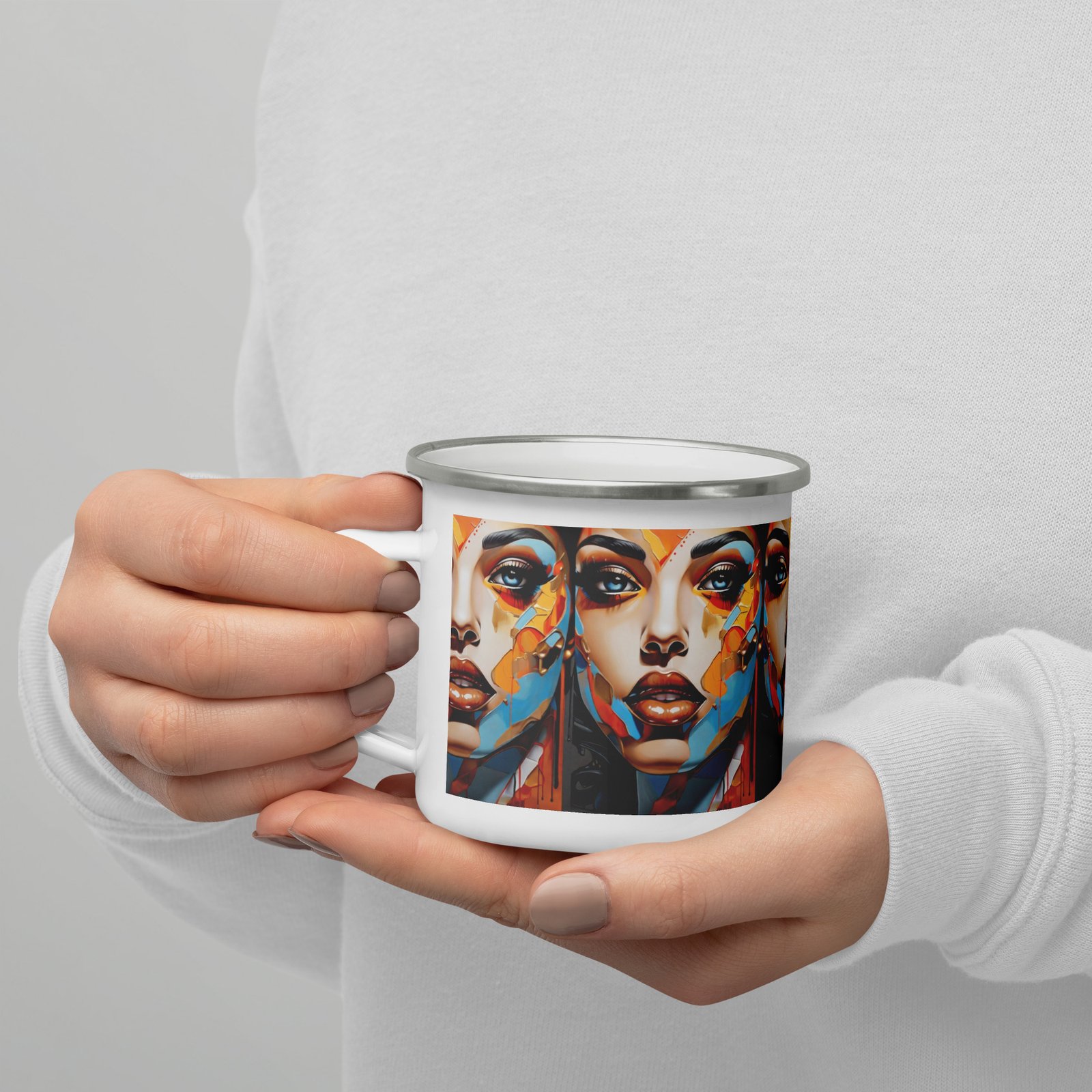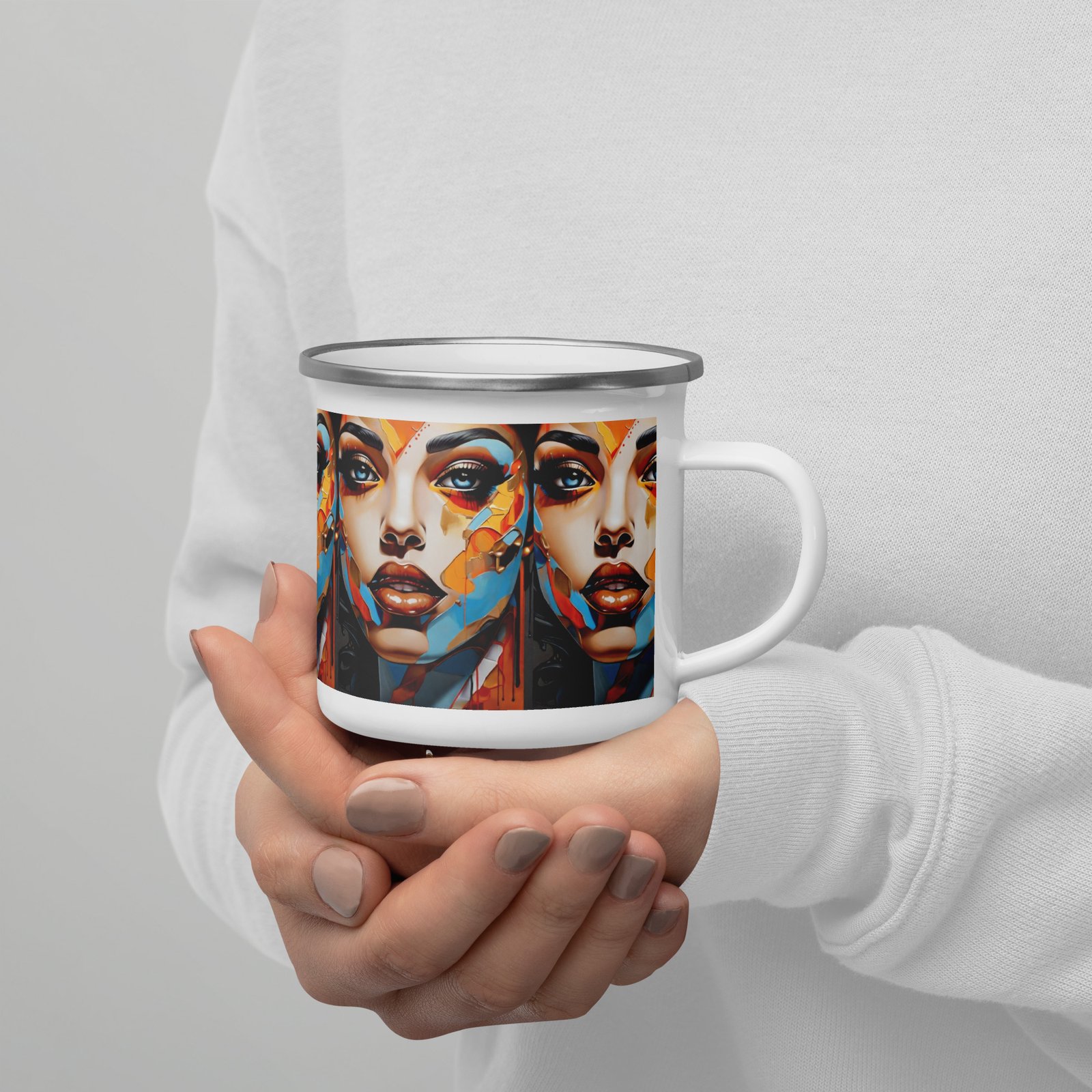 Start your day with a pop of passion and color! This durable enamel camping mug features a striking, contemporary art design—a powerful, painterly portrait that fuses intense emotion with abstract splashes of color. It’s more than just a mug; it’s a statement piece for your morning coffee, evening tea, or campfire cocoa.